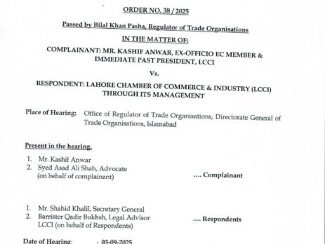 Alhamdulillah, “The Director General Trade Organizations (DGTO) Mr. Bilal Khan Pasha has accepted complaints filed by me and has rendered a detailed decision vide Order # 38/2025 Dt. 23/09/2025 in my favor and directed LCCI management to comply with his directions within 30 days from the order date”