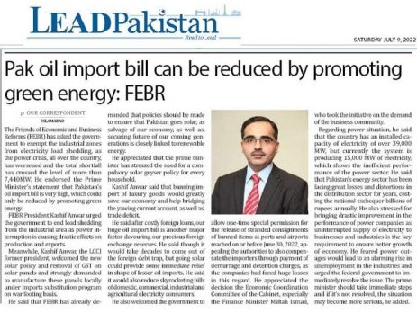 Pak oil import bill can be reduced by promoting green energy: FEBR